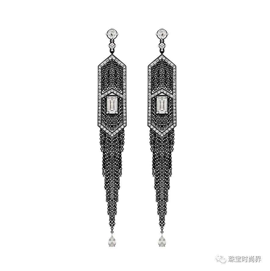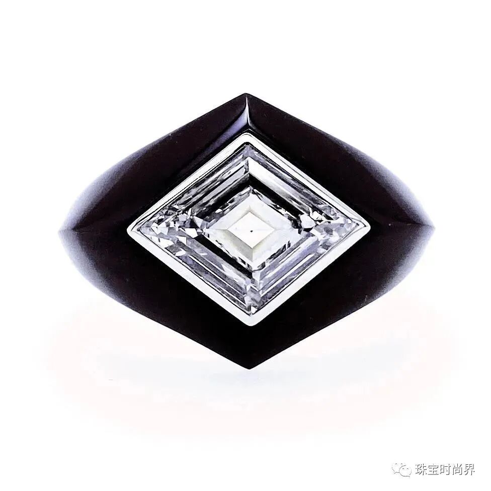主石为一颗菱形切割钻石,达到 D 色级,铂金戒托覆有黑色陶瓷。