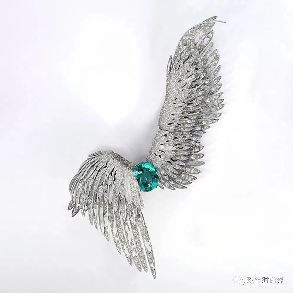 同样引人注意的还有一枚来自中国香港设计师 Elsa Jin 的Life钻石胸针,巧妙塑造出一对天使翅膀,羽翼层叠延展,由水滴形、圆形钻石错落镶嵌,胸针中央的主石为一颗重达71.93ct的椭圆形祖母绿,象征闪耀的希望。