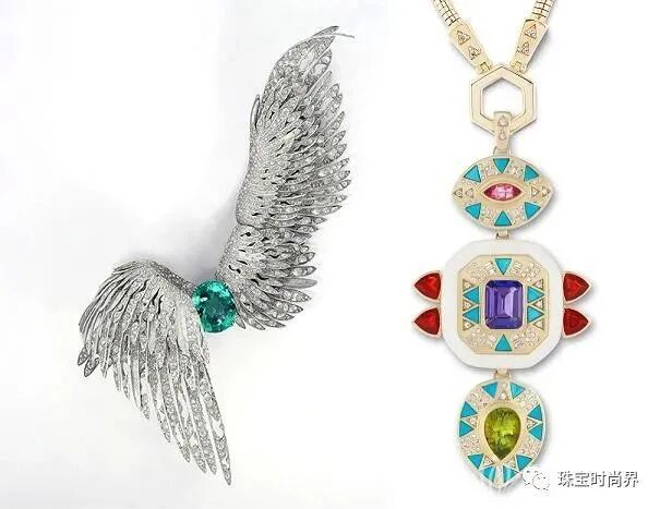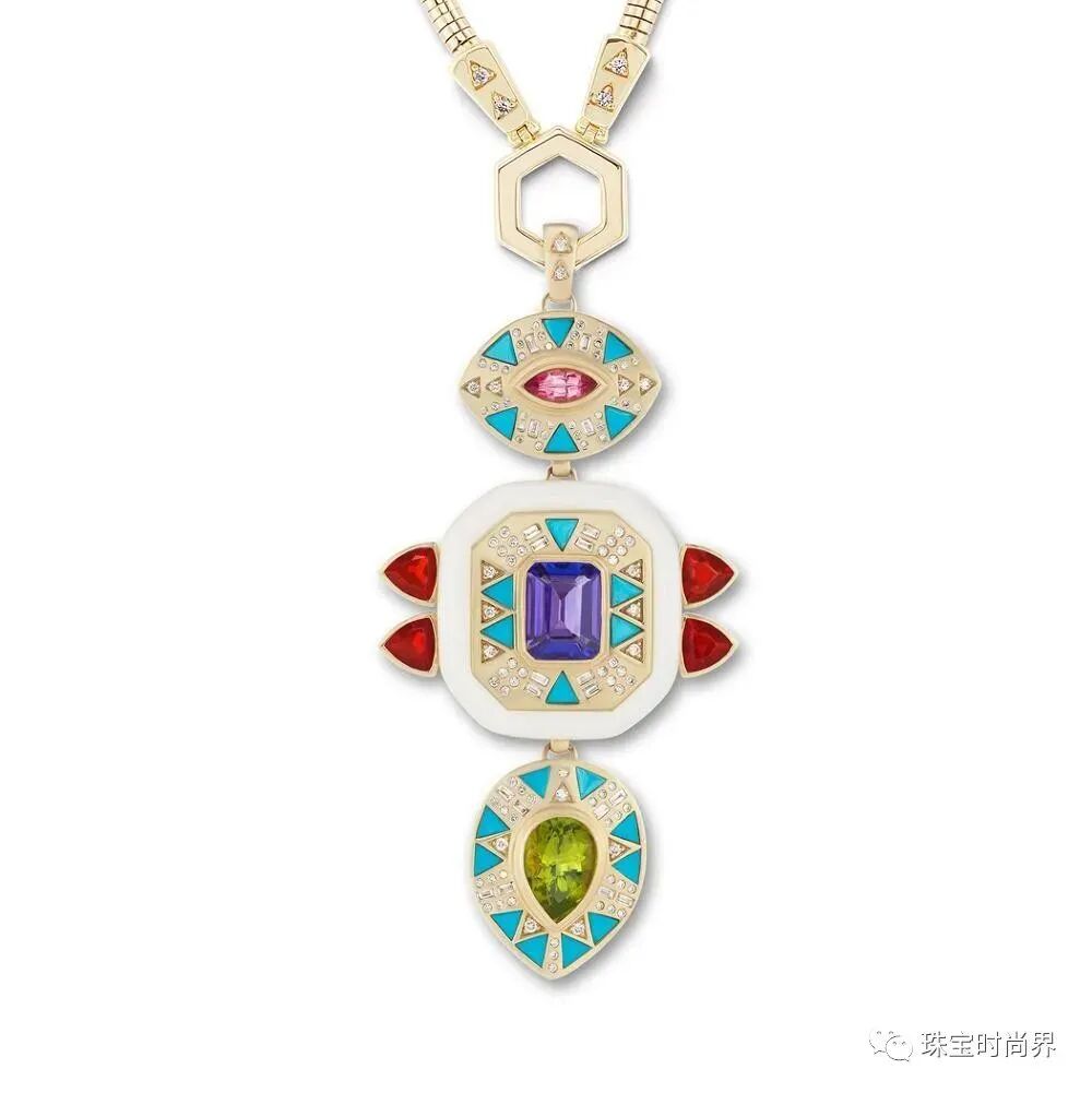 镶嵌榄尖形切割粉色尖晶石、祖母绿型切割坦桑石、三角形切割火欧泊、水滴形切割橄榄石,点缀三角形切割绿松石、长阶梯形切割和圆形切割钻石,搭配白玛瑙镶框。