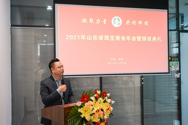 最后讲到:"各位同仁们。山东省珠宝商会在各级领导和主管部门正确指导下,一定会创造出更新、更优的业绩。让我们解放思想,实事求是,稳字当头、稳中求进,进一步推动山东珠宝业高质量发展,为山东经济发展、为我们美好的珠宝事业而努力奋斗!”